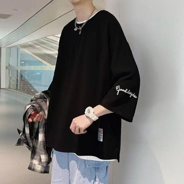 シャツ メンズ 七分袖 Tシャツ風 クルーネック ピークル 速乾 プルオーバー ドロップショルダー ゆったり 英字柄 刺繍入り カジュアル トップス 夏服に涼しく