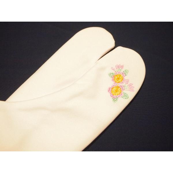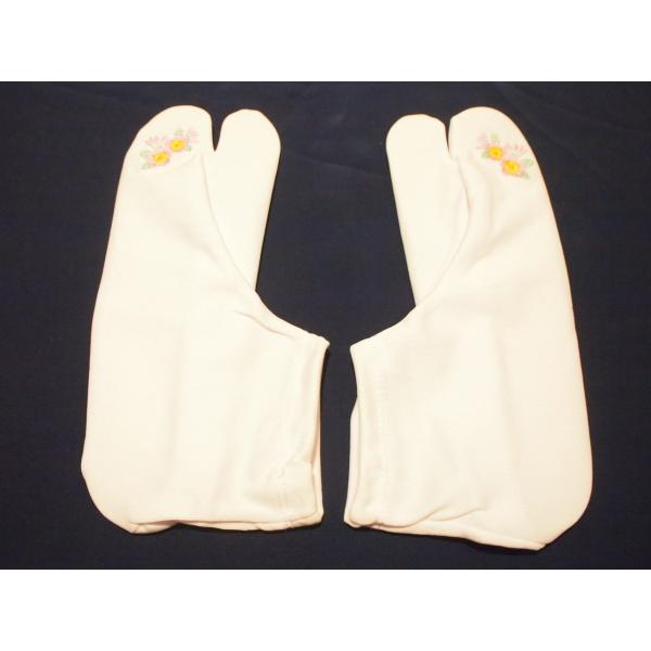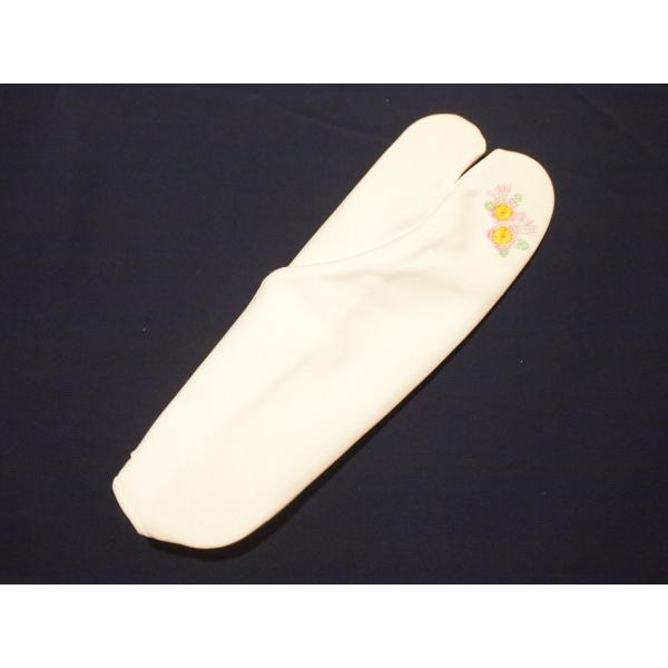 白色の地に両足のつま先部分に薄紫色と黄色の花の刺繍が入ります。