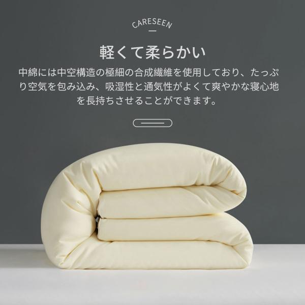 ■中綿には中空構造の極細の合成繊維を使用しており、たっぷり空気を包み込み、吸湿性と通気性がよくて爽やかな寝心地を長持ちさせることができます。