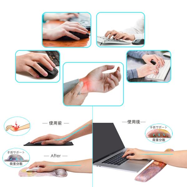 低反発なメモリーウレタンフォーム素材を採用し、円弧型のデザイン、完璧な手首のフィット感、触り心地がとても柔らかくて、手の肌に優しいです。リストレスト部は反発弾性が非常良く、優れた衝撃吸収性能を持っています