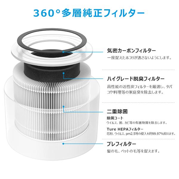 【簡単なお手入れ】True HEPA 4層プレミアムフィルタの効率を高め、寿命をより長くするためには、1ヶ月に1度 掃除を行ってください。柔らかいブラシや掃除 機のホースを使用してフィルタの外側を掃除して、髪の毛、埃、および大きなゴミを取り除いてください。(※注意:水洗いはできません)。