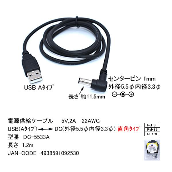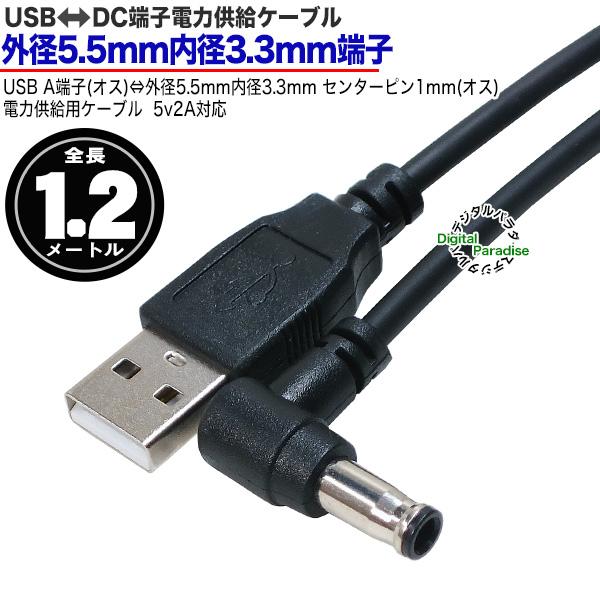 外径5.5mm 内径3.3mm センターピン1mm DC端子⇔USB(オス) 電源ケーブル 1.2m USBからDC端子変換 電源供給 充電 小型電子機器 電子雑貨 COMON DC-5533A