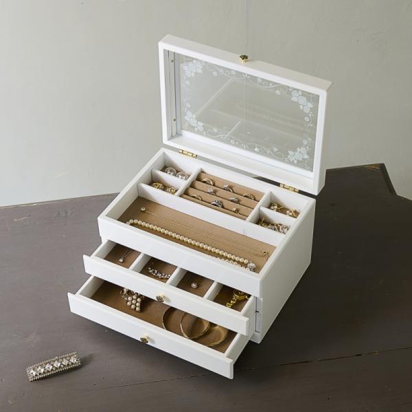 ジュエリーケース 木製 ガラス 3段 引き出し 仕切り アクセサリーケース ウッド 蓋付き 収納 保管 ジュエルケース ホワイト 日本製 W26.5×D19.5×H16.5cm