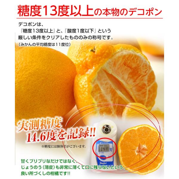 デコポンを名乗るには、糖度13度以上・酸味1%未満の厳しい基準をクリアしなければならず、品質レベルの高さが始めから違います。訳あり品なので外皮にキズ・スレ等はありますが中身の味は変わりません。