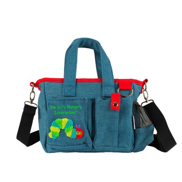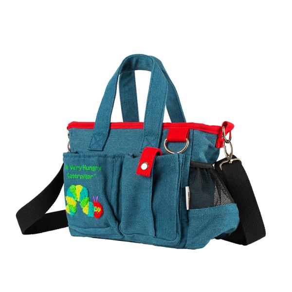 世界で一番の人気絵本「はらぺこあおむし」のお散歩バッグです。デニムと帆布に総柄プリントの2種類。