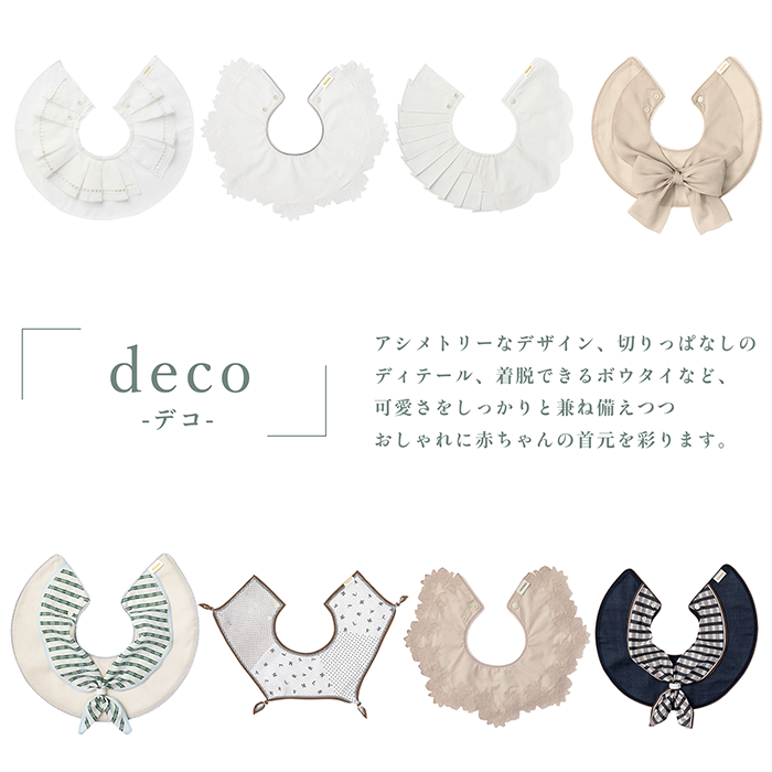 【特徴】マールマールのよだれかけは、360度どこからでも使える“まあるい形”。汚れたらクルッとまわせば、たくさん取り替える必要がありません。「Deco」はデザイン性と機能性の両立を徹底した、真骨頂ともいえるデコラティブなスタイシリーズ。アシンメトリーなデザイン、切りっぱなしのディテール、着脱できるボウタイ付きなど、モードアディクトなおしゃれ上級者にぴったりのアイテムです。