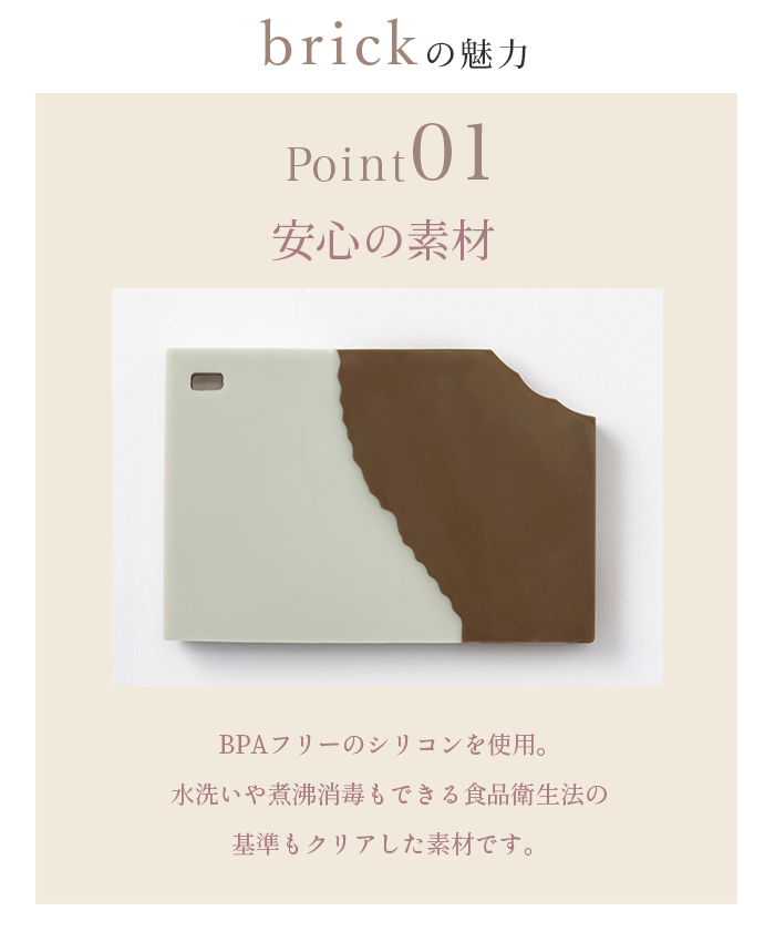 BPAフリーのシリコンを使用。水洗いや煮沸消毒もできる食品衛生法の基準もクリアした素材です。