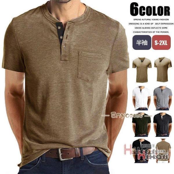 ヘンリーネックTシャツ メンズ Tシャツ 半袖 無地 胸ポケット付き カジュアル ス シンプル おしゃれ