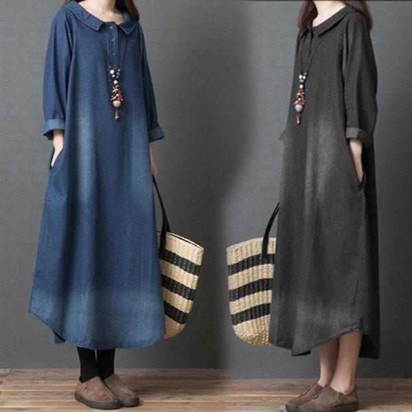 ワンピース デニム レディース30代 40代50代 ロング デニムワンピース長袖 ゆったり 大きいサイズ 体型カバー 着痩せ ラウンドネック