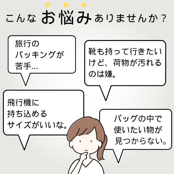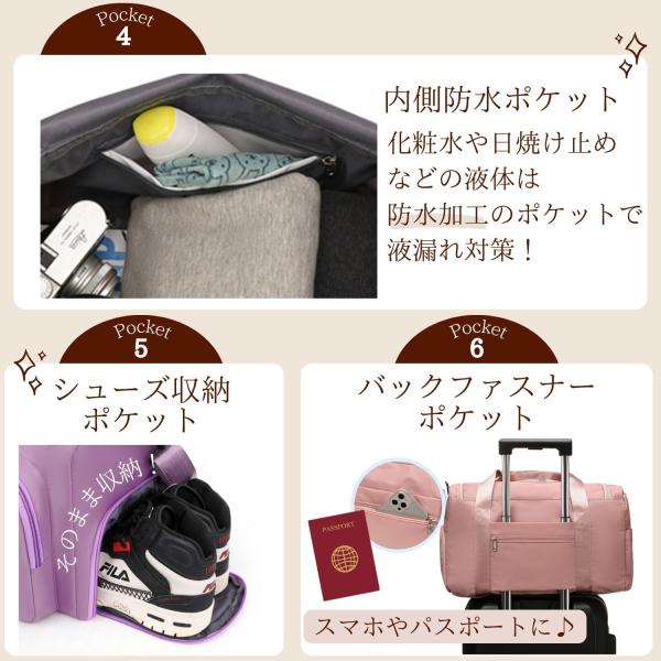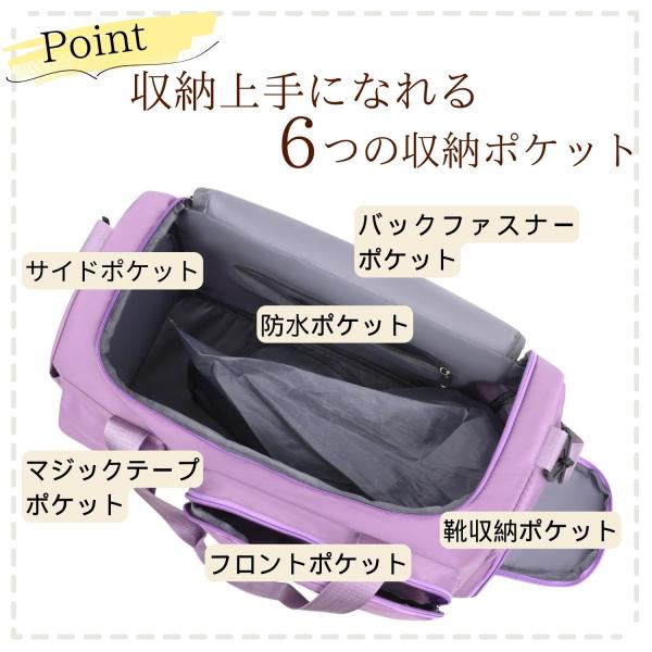 靴専用ポケットをはじめ、防水ポケットや、小物収納ポケットなど