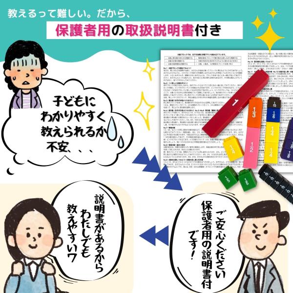 お子様のサポートをしたいけど、説明が難しい…そんなお悩みを解決するため、保護者の方向けの説明書を付属しております。 ステップごとにブロックの使い方を含め、どの点に着目して考察するのかのポイントをまとめてありますのでぜひご活用ください。