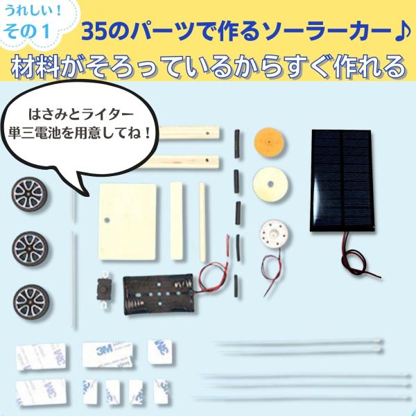 35個のパーツを組み立てて、ソーラーカーを作ってみましょう!はさみ、ライター、単三電池2本をご用意ください。はさみやライターは大人と一緒に作業をお願いいたします。日本語説明書・商品作成動画のご案内を一緒にお送りします。工作が苦手な保護者の方でも、動画を見ながら楽しく作れます。