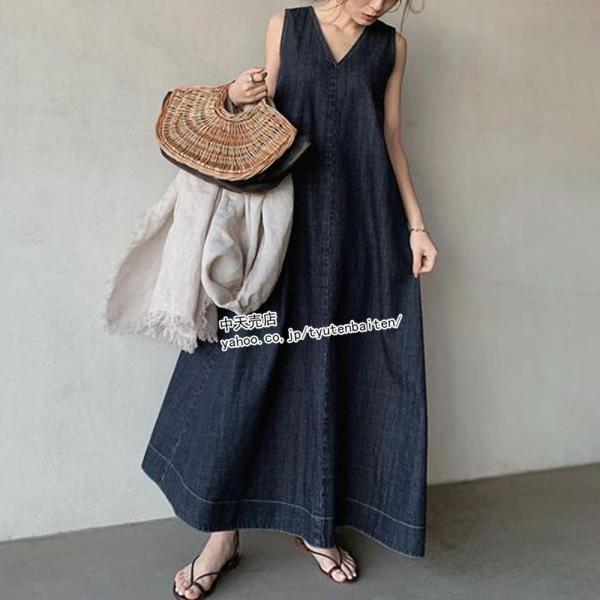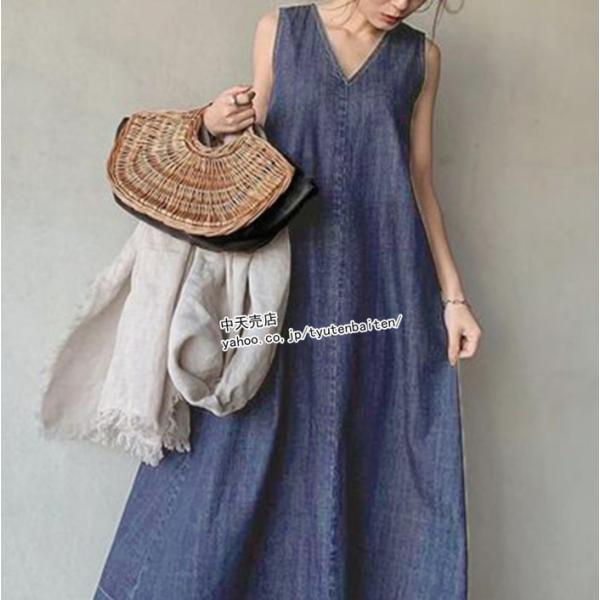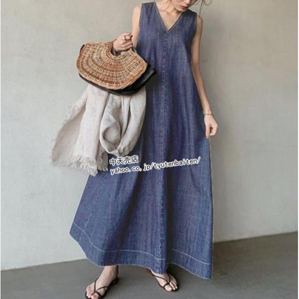 デニムワンピース ゆるワンピース サマーワンピース ノースリーブ ゆったり 大きいサイズ マキシワンピース Vネック 通勤 通学 カジュアル ママ服 キレイめ