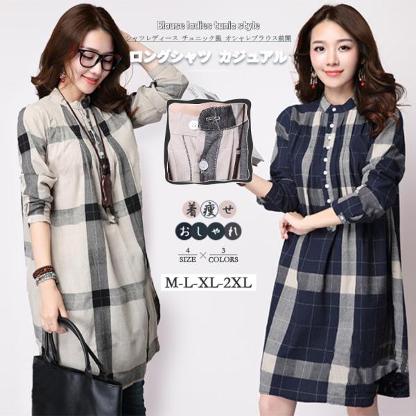 シャツ春秋レディース チュニック風 オシャレブラウス前開 長袖トップス 韓国風 ゆったロングシャツ 体型カバー カジュアル 折り襟シャツ 気質 通勤 就活 面接