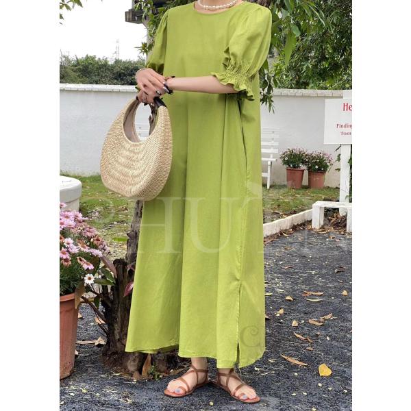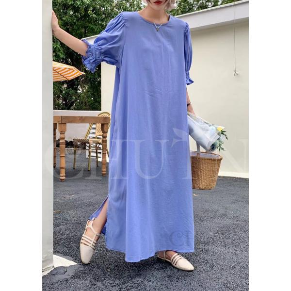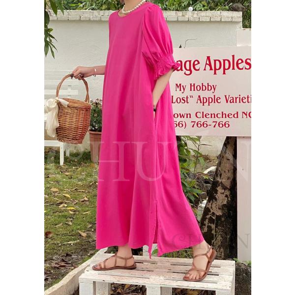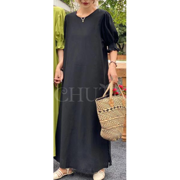ロングワンピース レディース ボリューム袖ワンピース ラウンドネック スリット ゆるワンピース パフスリーブ 半袖 マキシ丈 春夏 無地 カジュアル 体型カバー