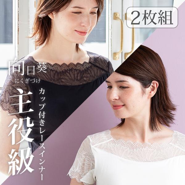 ブラトップ 半袖 レース インナー レディース カップ付き ノンワイヤー スクエアネック フレンチ袖 綿混 フィットブライン 2枚組 おしゃれ