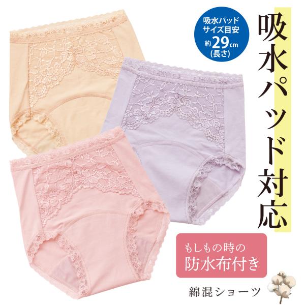 ショーツ 尿とりパッド 吸水パッド対応 尿漏れパンツ 女性 レース付き 綿95% 綿混 専用 吸水ライナー 尿漏れパッド はがれにくい パッドが大きい 3色組