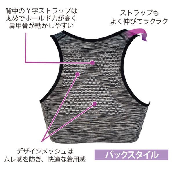 背中のY字ストラップは太めの作りでホールド力が高く、肩甲骨が動かしやすい構造。