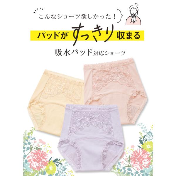 ショーツ 吸水パッド対応 専用 尿漏れ 尿取り 女性 レース付き 綿95% 綿混 コットン 吸水ライナー パット はがれにくい パッドが大きい おすすめ