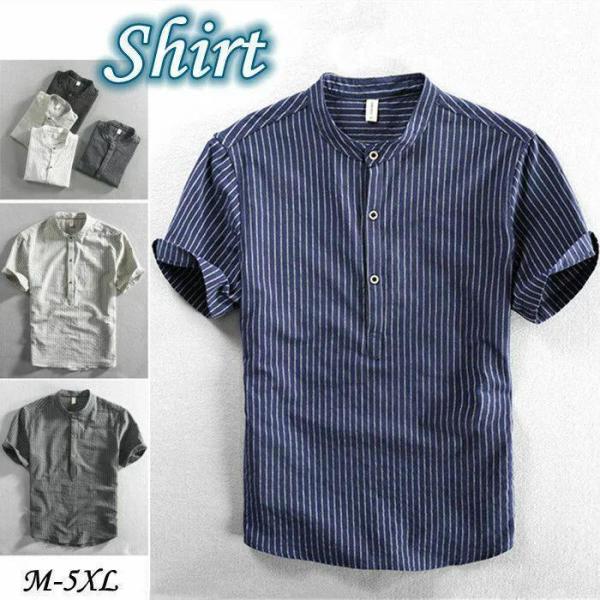 シャツ 半袖シャツ メンズ 立ち襟 スタンドカラー カジュアルシャツ プルオーバーシャツ ヘンリーネック shirt ストライプ柄 M-5XL