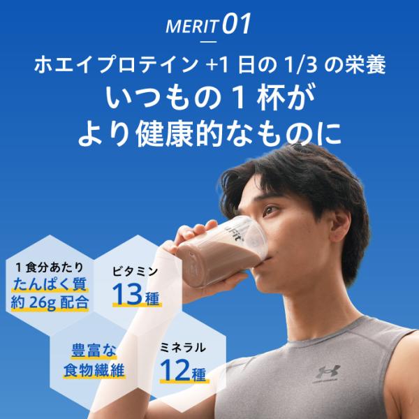 uFit完全栄養ホエイプロテインに含まれるたんぱく質は1杯につき最大約26g。1杯で豊富な栄養とたんぱく質が摂れます。