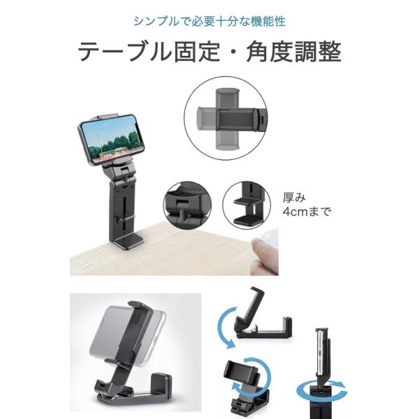 トラベル スマホホルダー 折りたたみ クランプ 飛行機 新幹線 バス スマホ スタンド 小型 コンパクト スマートフォン 携帯用 マルチアングル 回転 固定