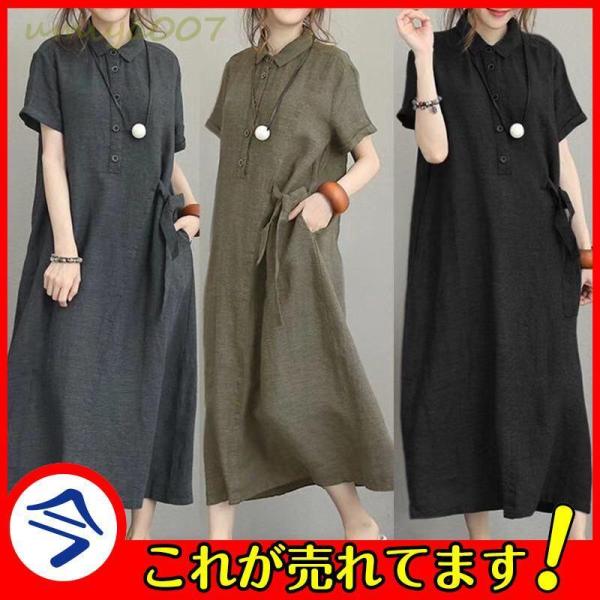 シャツワンピース レディース 夏 綿麻 ワンピース 40代 50代 折り襟 半袖 ロングワンピース 無地 韓国風 ゆったり 通勤 カジュアル 大きいサイズ