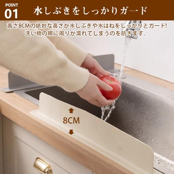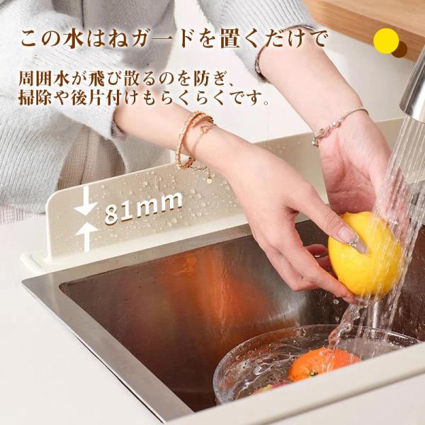 シンクで野菜や食器を洗うときの水しぶきをしっかりガード!高さ8cmのシリコン製ガードが周囲への水はねを防ぎ、調理台や床を濡らさずに快適に使えます。