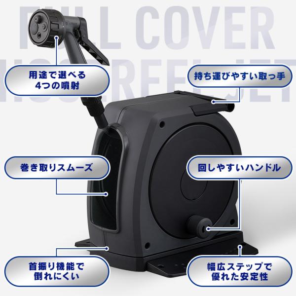 (検索用:ホースリール 散水ホース 15m フルカバー 高圧 ジェット 洗車ホース 掃除 おしゃれ 伸びるホース 4水形 散水ノズル ベランダ 庭 コンパクト 4967576773638)