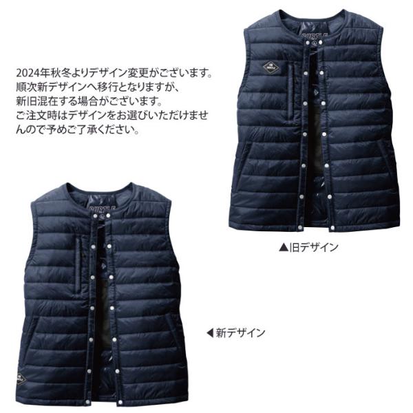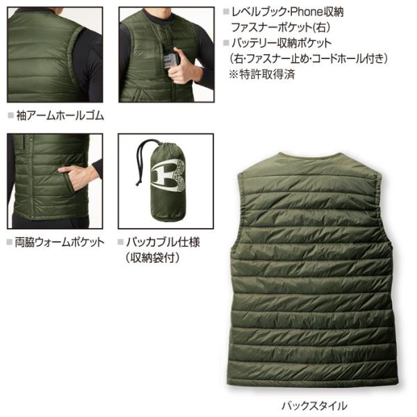 別売りのサーモクラフト(電熱パッド)装着対応で抜群の保温力を追求。非常に軽量で耐久性の高い高密度ナイロンタフタを使用したインナークルーネックベスト。内部に保温性の高い吸湿発熱性に優れたアクリルとダウンのハイブリット中綿を封入。コンパクトに折り畳むことができ、持ち運びやすいパッカブル仕様。フロントには着脱しやすいスナップボタン仕様。