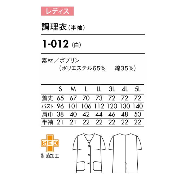 調理白衣 1-012 レディース 飲食店 ユニフォーム 半袖 抗菌 厨房 白衣 調理服 割烹 板前服 住商モンブラン