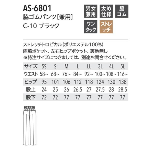 AS-6801 ストレッチパンツは、飲食店やカフェのユニフォームとして最適な男女兼用のスラックスです。ポリエステル100%のストレッチトロピカル素材を使用し、動きやすさを追求しています。ワンタックと脇ゴム仕様により、快適なフィット感を提供します。両脇ポケットと左右ヒップポケットがあり、実用性も兼ね備えています。シンプルで洗練されたデザインは、さまざまな職場環境に適しています。