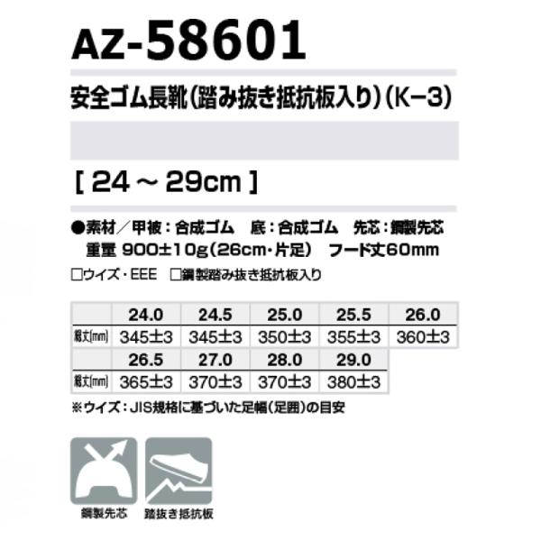 安全ゴム長靴 AZ-58601 24〜29cm 踏み抜き抵抗板入リK-3 アイトス AITOZ