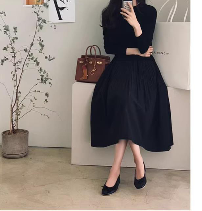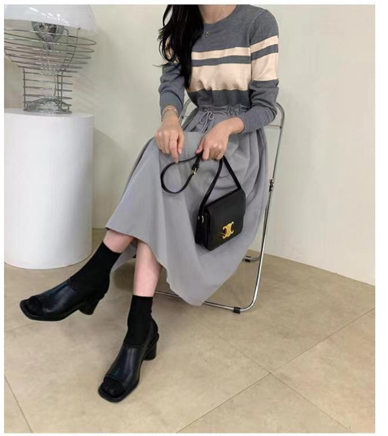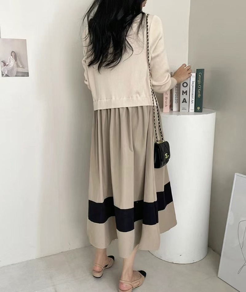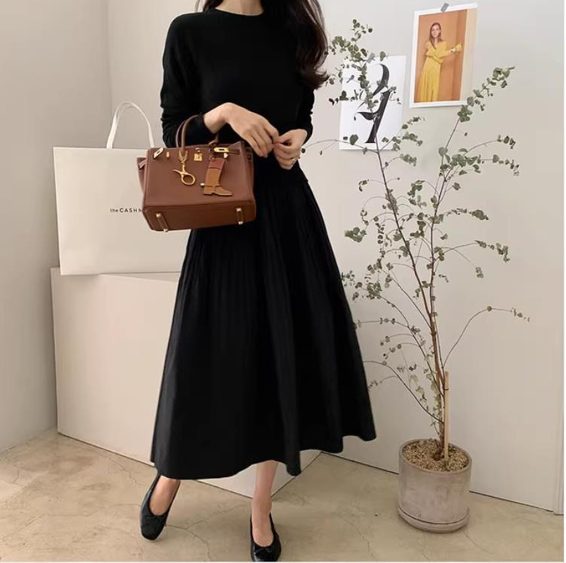 ワンピース 春 きれいめ フォーマル 大きいサイズ ニット ロングワンピース レディース 長袖 ミモレ丈 黒 ニットワンピース 異素材 切替 着〓せ
