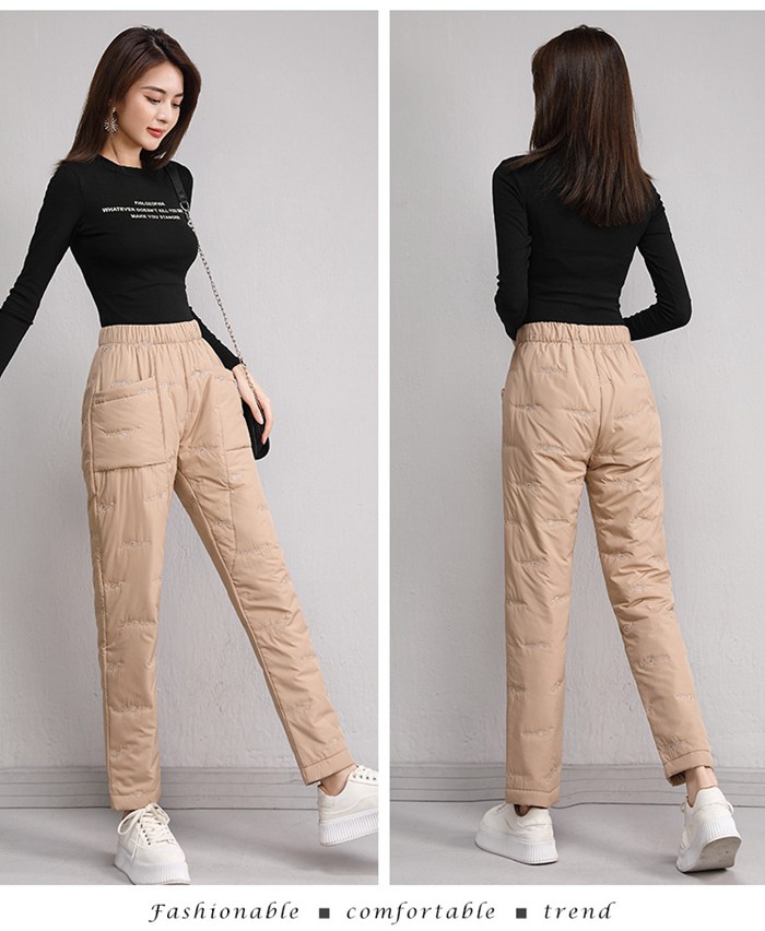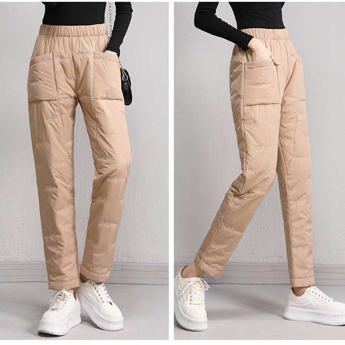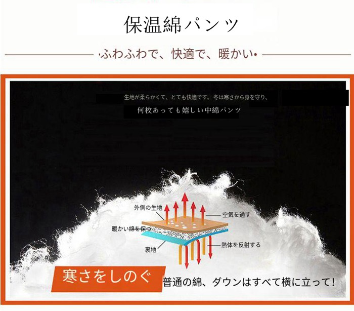秋冬ファッション性と機能性を融合させたダウン風中綿パンツ登場!ウエスト部分は総ゴムで履きやすい。