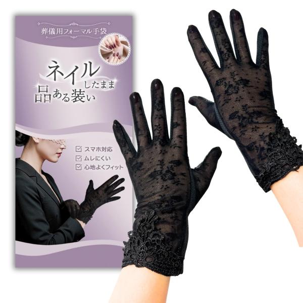 [Bliss Gee] 葬儀用 フォーマル手袋 レディース 黒 ネイル シミ シワ隠し 指長効果 レース 通気性 メッシュ加工 スマホ対応