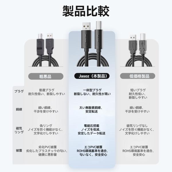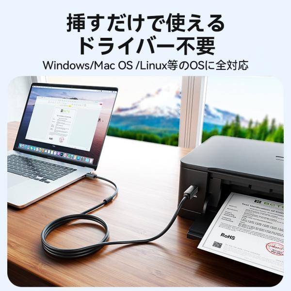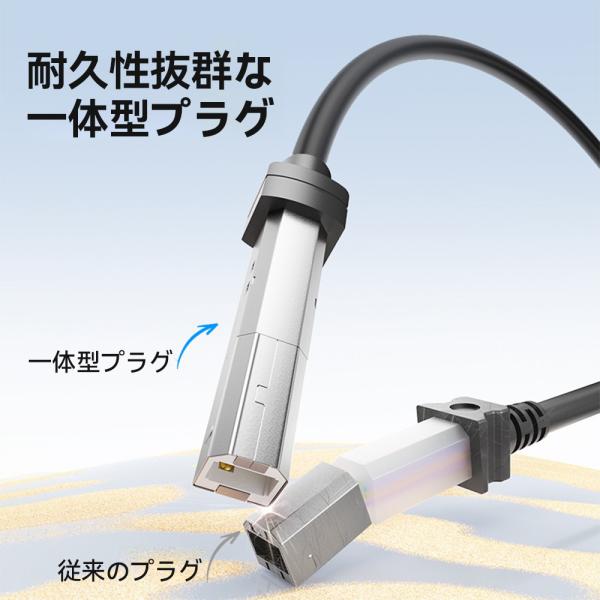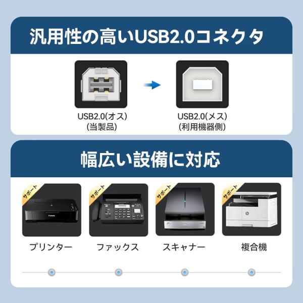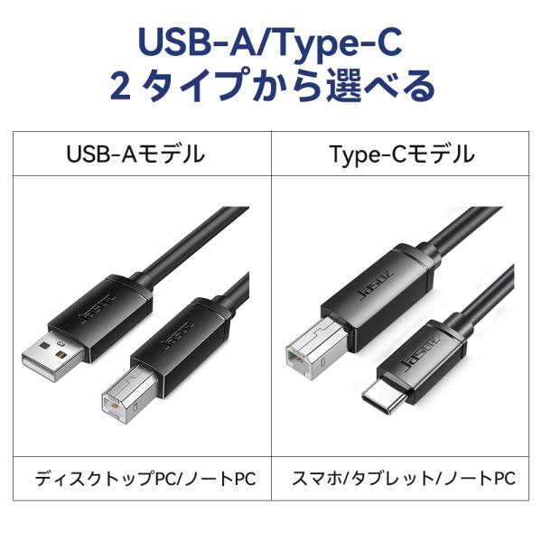 汎用性の高いプリンターケーブル、「USB-A/Type-C」2種類のプラグから選べます、パソコン、タブレット、スマホ等から、複合機、スキャナー、プリンター等幅広い設備に有線接続、耐久性抜群の一体型プラグ、多重保護シールド、ノイズを低減するフェライトコア(電磁石)搭載、高性能、高品質のプリンターケーブル。