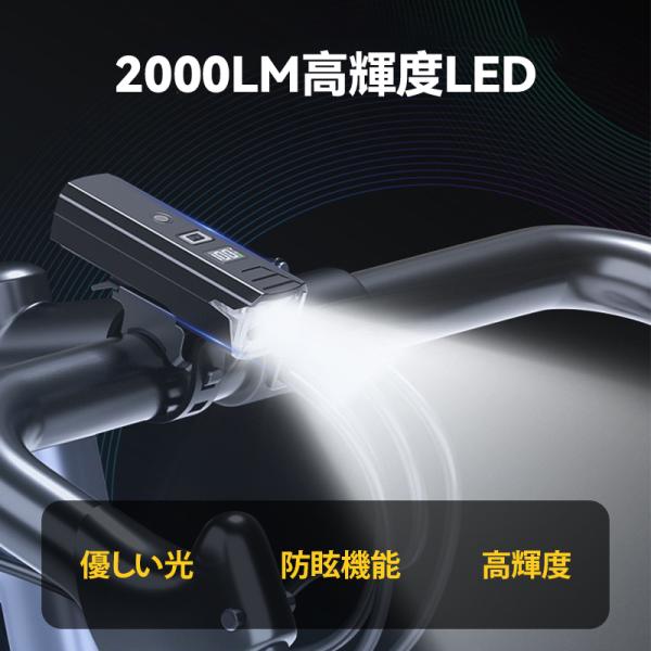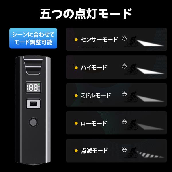 USB充電式(大容量バッテリー)自転車用LEDライト、2000ルーメン高輝度、IP7防水、感光センサー搭載(自動点灯、自動明るさ調整)、五つの点灯モードを切替可能、防眩機能を備えました、自転車通勤/通学に必須なアイテム。