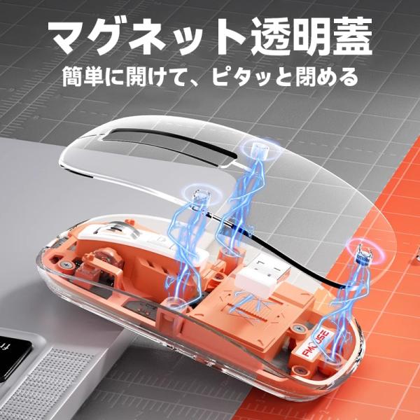 最新型、完全透明なワイヤレスマウス、透明な外殻は高純度のPP結晶を採用し、光透過率99%の綺麗なアイスクリスタル外殻を作り上げました、磁気式のフタは開閉可能です。