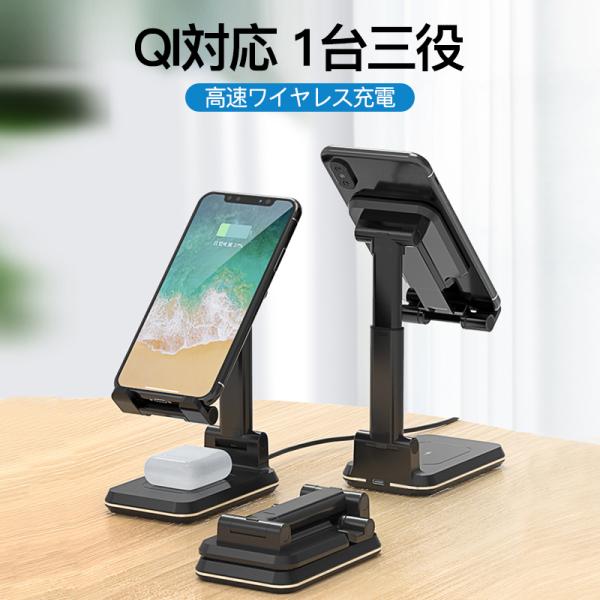 ワイヤレス充電器 QI 充電 スマホスタンド 折りたたみ 2台同時 iPhone 17 16 15 14 13 Airpods pro 急速 無線 チャージャー Andriod 置くだけ 15W アイフォン