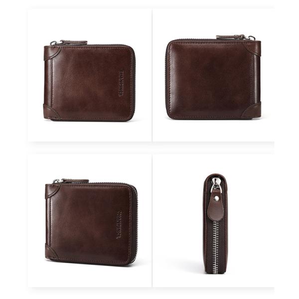 高級本革(牛革)を採用した二つ折り財布、小銭入れ、ファスナータイプ、スキミング防止機能付き。