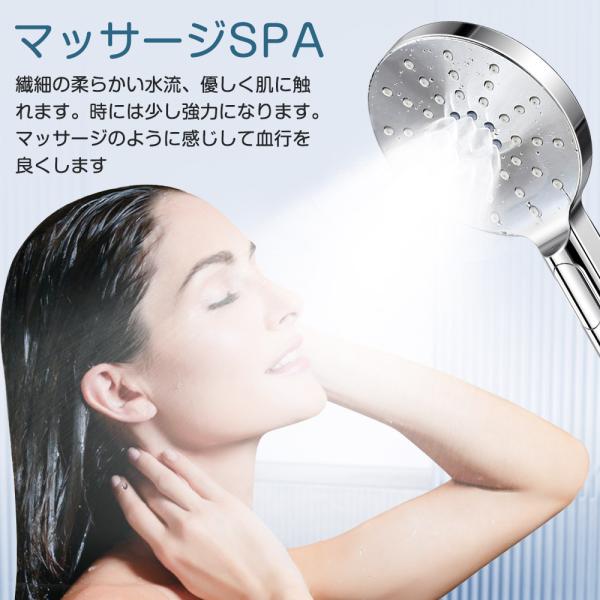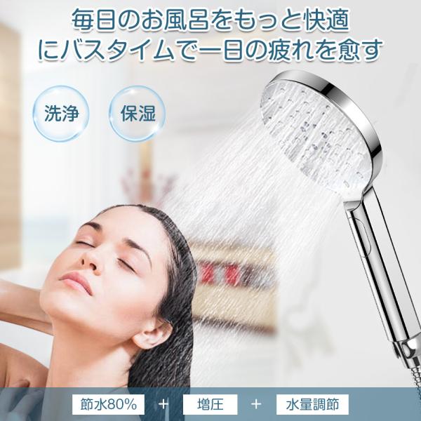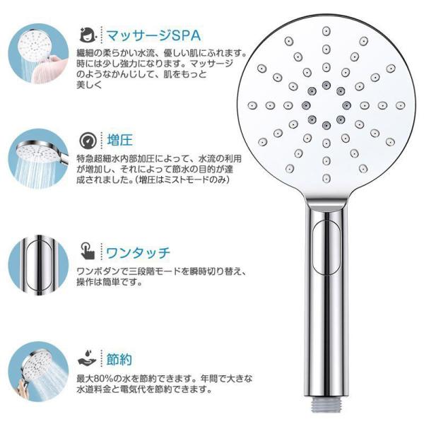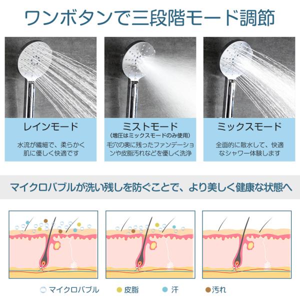 【3段階水量調整モード】[レイン+SPA+ミスト増圧モード]3つの切り替えモードが最新モデルシャワーヘッド!モード切替ボタンを押して簡単に切り替えることができます。「レイン」モードはたっぷりな水量で泡と汚れが一瞬に落とす。「SPA」モードはミストのように周囲に大きくて吐水して、小さな泡が毛穴の奥の皮脂や汚れやニオイを吸着洗浄。「ミスト増圧モード」全面的に散水して、快適なシャワー体験します(増圧はミストモードのみ)。洗顔をするときは、頭髪ケアをしたいときは状況に応じて使い分けができます。