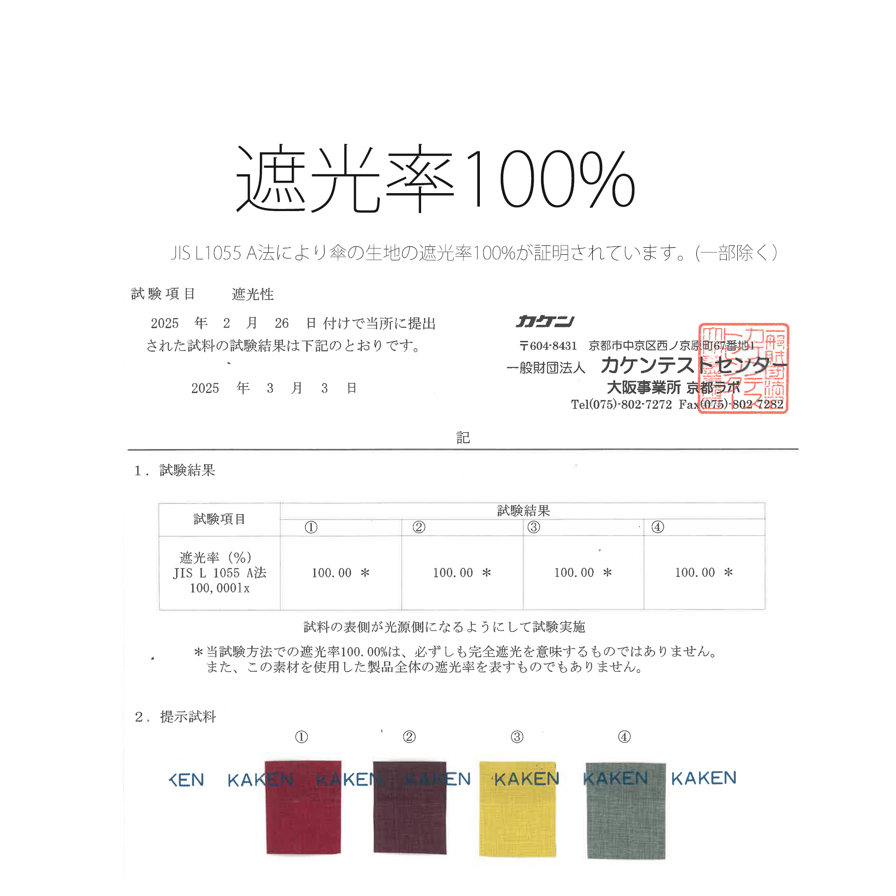 JIS基準生地測定値の遮光率100%の 1級遮光生地を使用していますので 遮光・紫外線遮蔽・遮熱効果に優れています。
