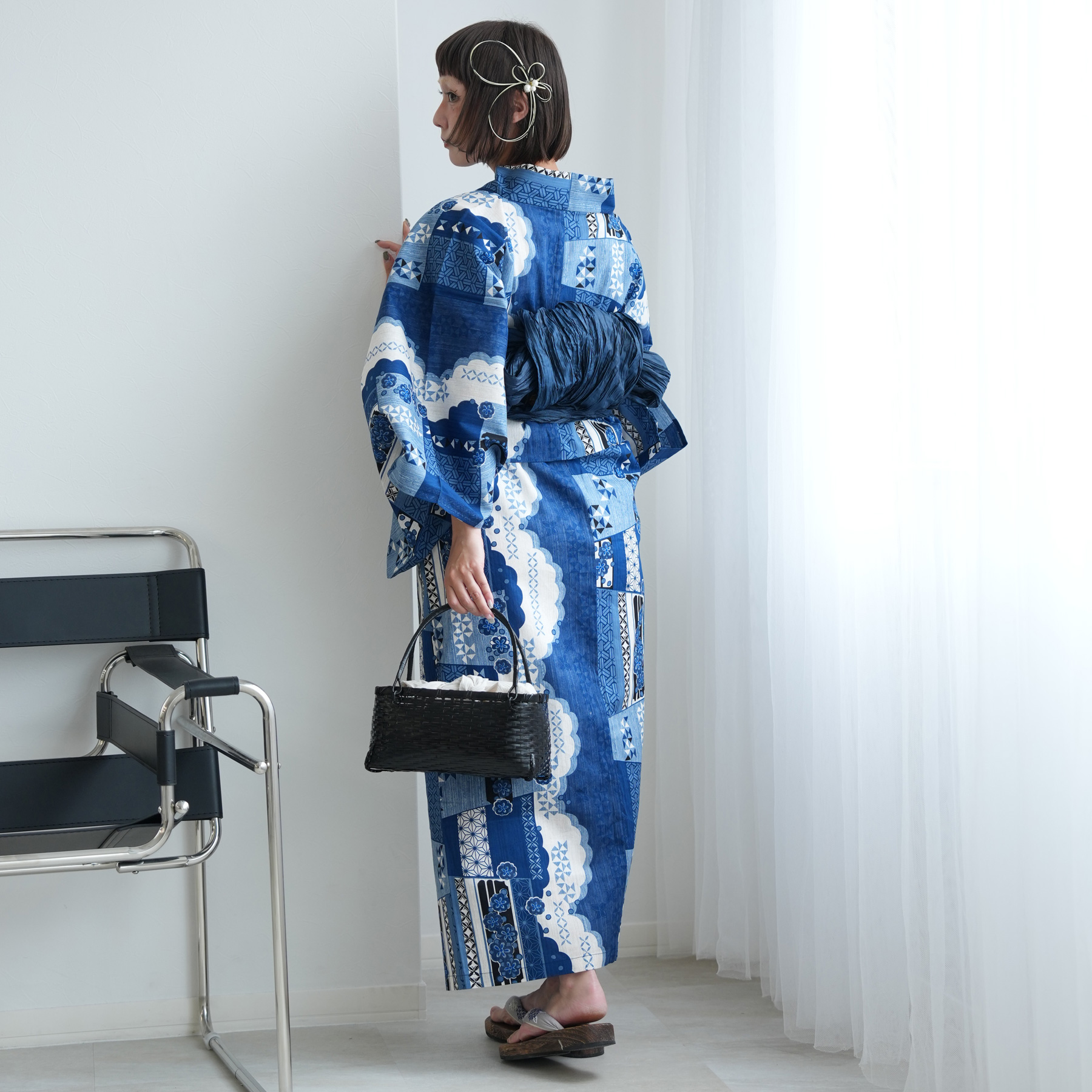 浴衣 レディース セット ニコアンティーク セパレート二部式 3点セット(ゆかた上下・帯・下駄) スカラップ雲取 ブルー フリーサイズ