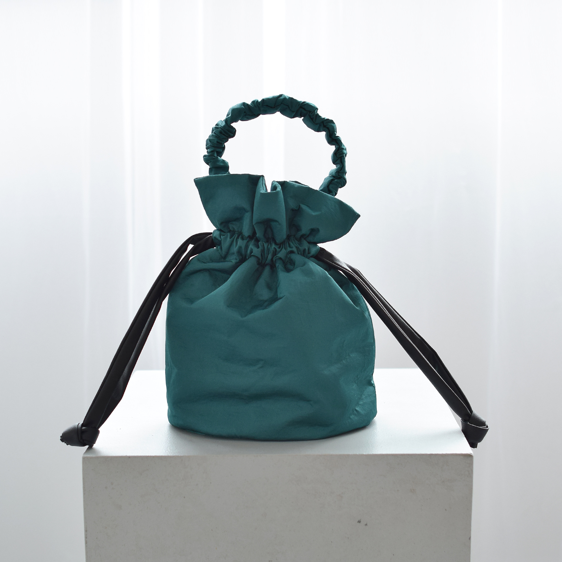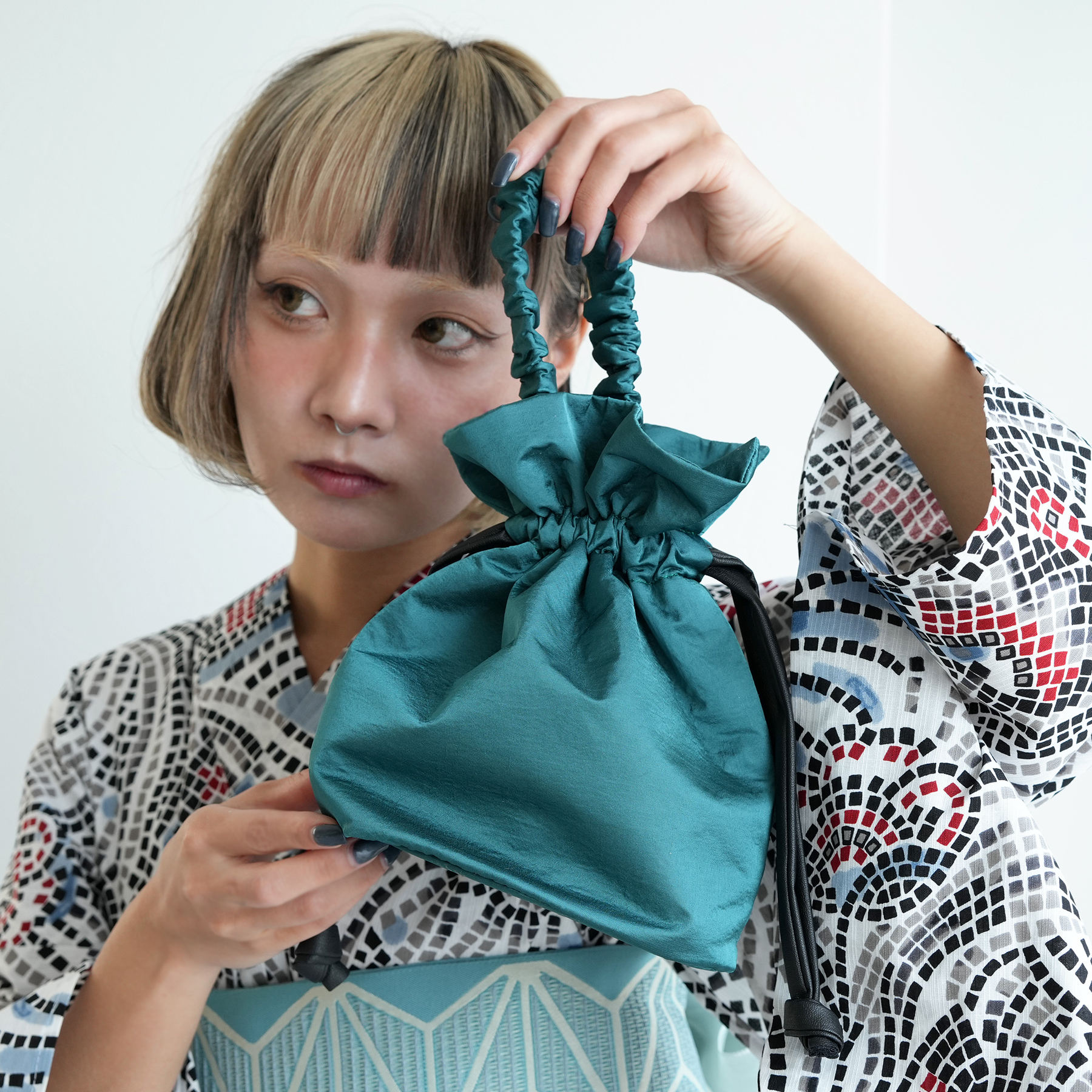 巾着バッグ おしゃれ utatane ギャザーハンドル レザー調コード 普段使い 袴用バッグ 浴衣用バッグ 日本製 袴 卒業式 ミニバッグ サテン ブルーグリーン 青緑