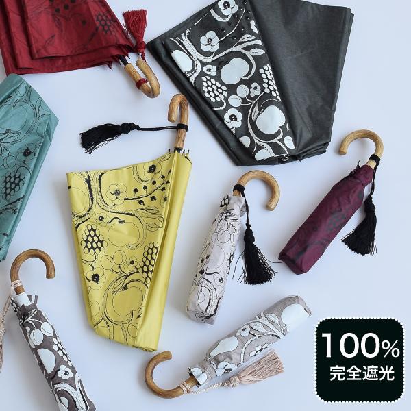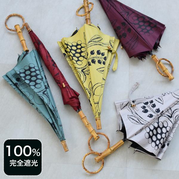 日傘 完全遮光 長傘 小さめ utatane×Kuovi クオヴィ 親骨47cm 晴雨兼用 スライドショート 北欧色シャンブレー/果樹園 オーチャード 総柄 バンブー リング 竹