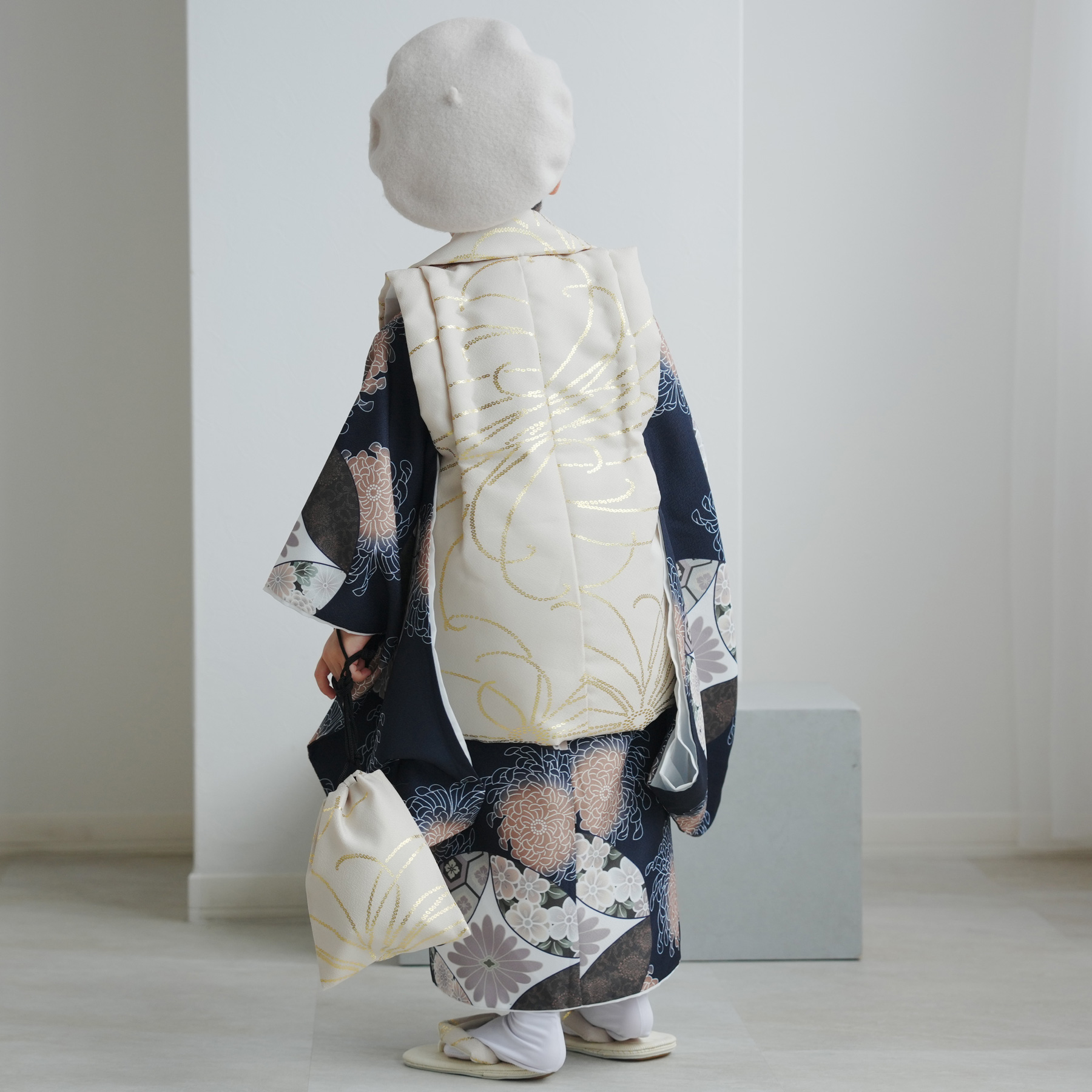 七五三 着物 3歳 男の子 被布 ひよこ商店 kids ベレー帽 被布フルセット ベージュ金彩×ネイビー七宝 レトロ 大正浪漫 3歳男子 子供 キッズ 販売 購入