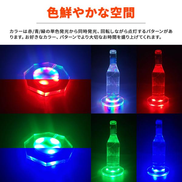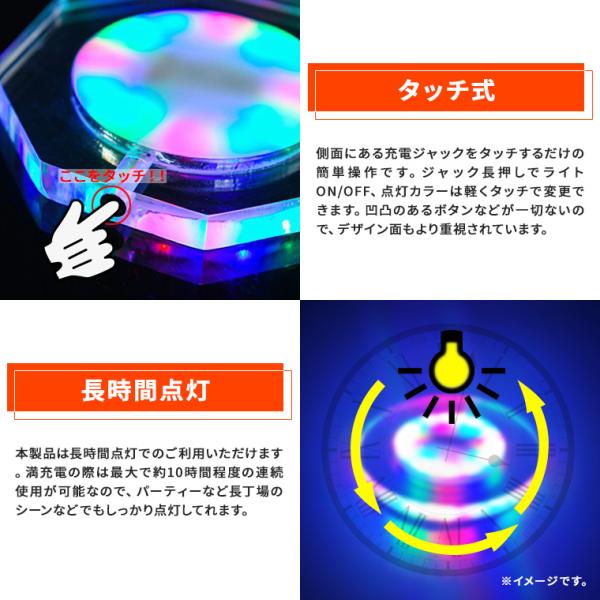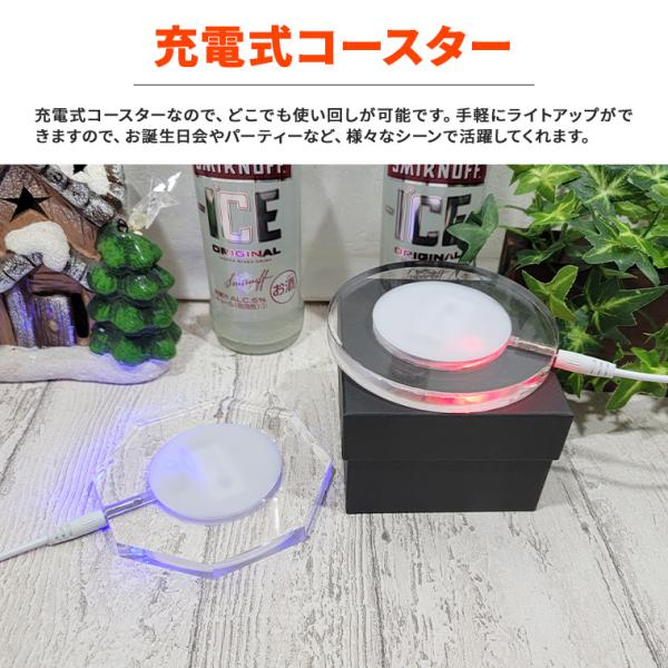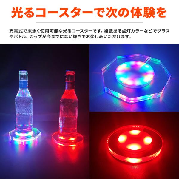光るコースター 充電式 ライトアップ コースター ライトコースター LEDコースター 丸型 八角形 四角形 RGB パターン 点灯 USB充電 タッチ式 きれい おしゃれ