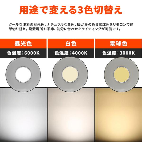 ●3色切替え。クールな印象の昼光色、ナチュラルな白色、暖かみのある電球色をリモコンで簡単切り替え。