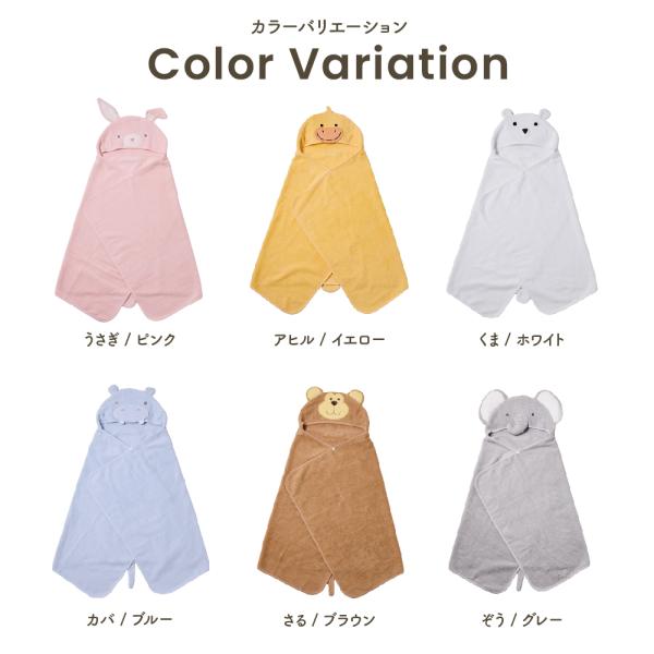 クマ、カバ、ウサギ、アヒル、ゾウ、サル…フードをかぶれば、アニマルに大変身!「かわいい!」と自ら着用してくれるからお着替えタイムがもっと楽しくなります。